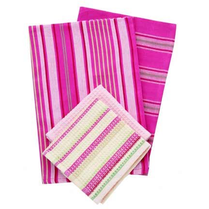 Add fun and colors into your kitchen basics. This set consists of two 18 x 28" teatowels and two 13 x 13" dishcloths. 100% cotton.