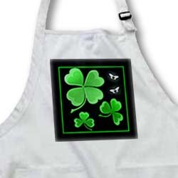 A pretty shamrock clover design on a dark background with little silvery white butterflies Apron is commercial quality product. Whether it's put to use in a restaurant or home, this apron will always help keep you clean. 100% cotton with Teflon finish for added protection. 1" wide neck and waist ties, adjustable neck strap for full and medium length aprons.
