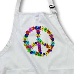 Peace Sign Flower Power Design Apron is commercial quality product. Whether it's put to use in a restaurant or home, this apron will always help keep you clean. 100% cotton with Teflon finish for added protection. 1" wide neck and waist ties, adjustable neck strap for full and medium length aprons.