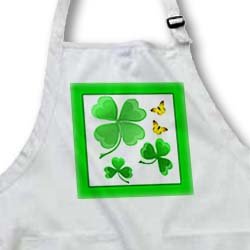 A pretty shamrock clover design with little golden butterflies Apron is commercial quality product. Whether it's put to use in a restaurant or home, this apron will always help keep you clean. 100% cotton with Teflon finish for added protection. 1" wide neck and waist ties, adjustable neck strap for full and medium length aprons.