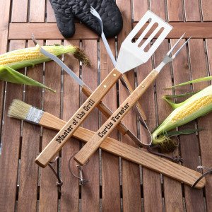 Our sizzling Grill Master© BBQ Utensil Set gives the outdoor chef a hand and all the credit!Set includes: - 18" Spatula, with long handle for safety. - 18" Fork, ideal for lifting heavy cuts of meat. - 15 1/2" Chef Tongs for moving items from grill to table. - 18" Basting brush to slather on the sauce!And there is no mistaking who the BBQ Master is, with any personalization handsomely engraved across the handle of the spatula and fork!Set is quality crafted from durable, rust resistant stainless steel with extra-sturdy, stay cool wooden handles and leather rope ties for convenient hanging. Add one of our personalized BBQ Aprons for a great gift combination! Perfect for Father's Day, birthdays, or housewarming gift!Sure to inspire them to fire up the barbecue grill, rain or shine, all season long!