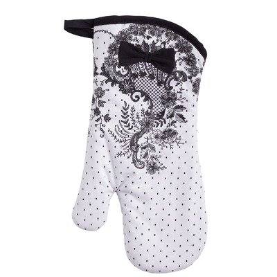 - French Lace Oven Mitt featuring a white with black lace pattern with black trim